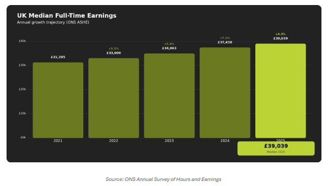 Median full-time UK earnings reached £39,039 in April 2025, reflecting 4.3% annual growth, according to the Office for National Statistics.